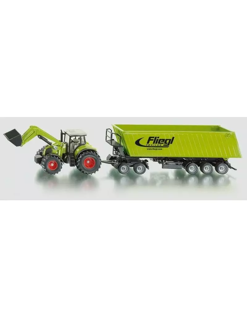 De Claas Axion 950 met beweegbare bak en voorladercoulisse trekt een 3-assige Fliegl-kiepwagen met kantelbak die op een dolly met tandemas is gelegd. Met deze zelfstandige combinatie van hoogwaardige metalen en kunststofonderdelen kan zowel worden geladen als getransporteerd. De kiepwagen met kantelbak met dolly kan worden gecombineerd met elke SIKU-tractor, schaal 1:50 en kan in de oogstketen tevens worden gebruikt voor het lossen van een maaidorser. De kantelbak is kantelbaar. De achterklep kan worden geopend. Uitklapbare steunvoet om de kiepwagen met kantelbak te parkeren. De dolly kan eveneens worden gebruikt met de modellen uit de SIKU-Super serie, schaal 1:50.