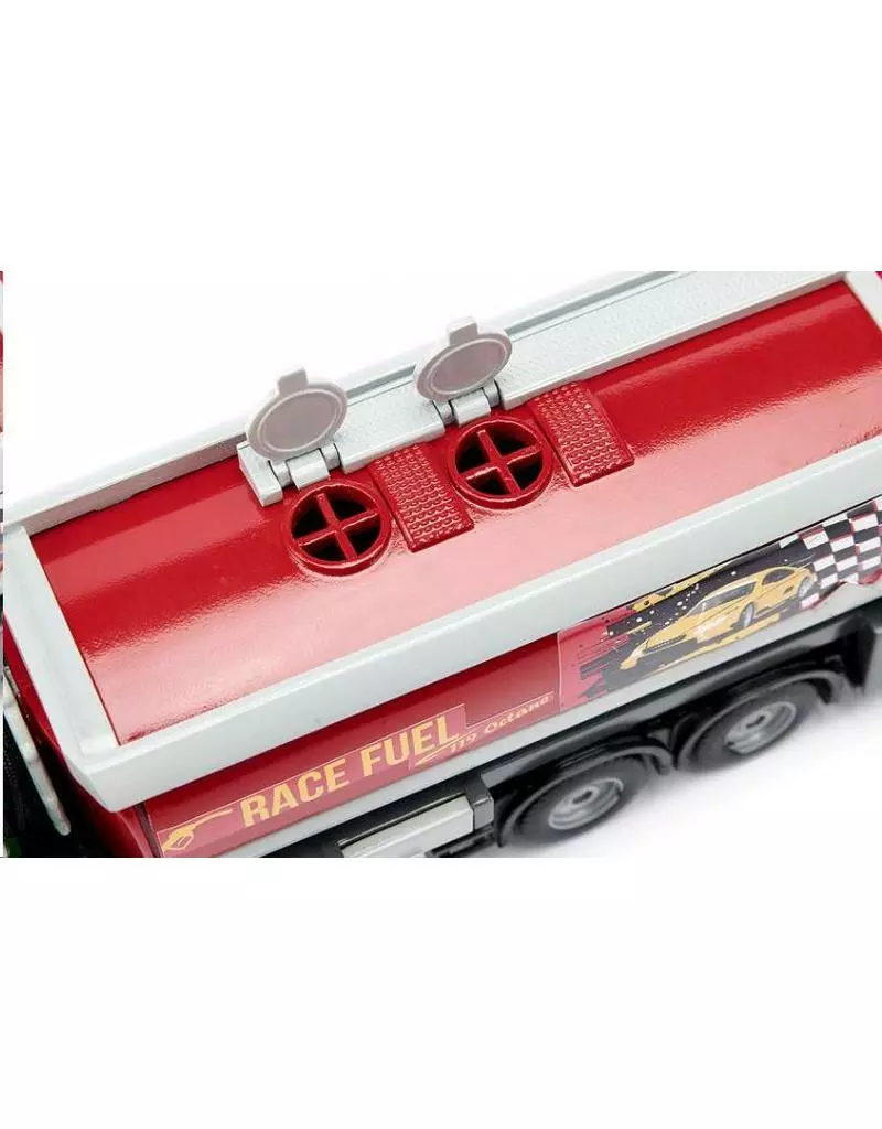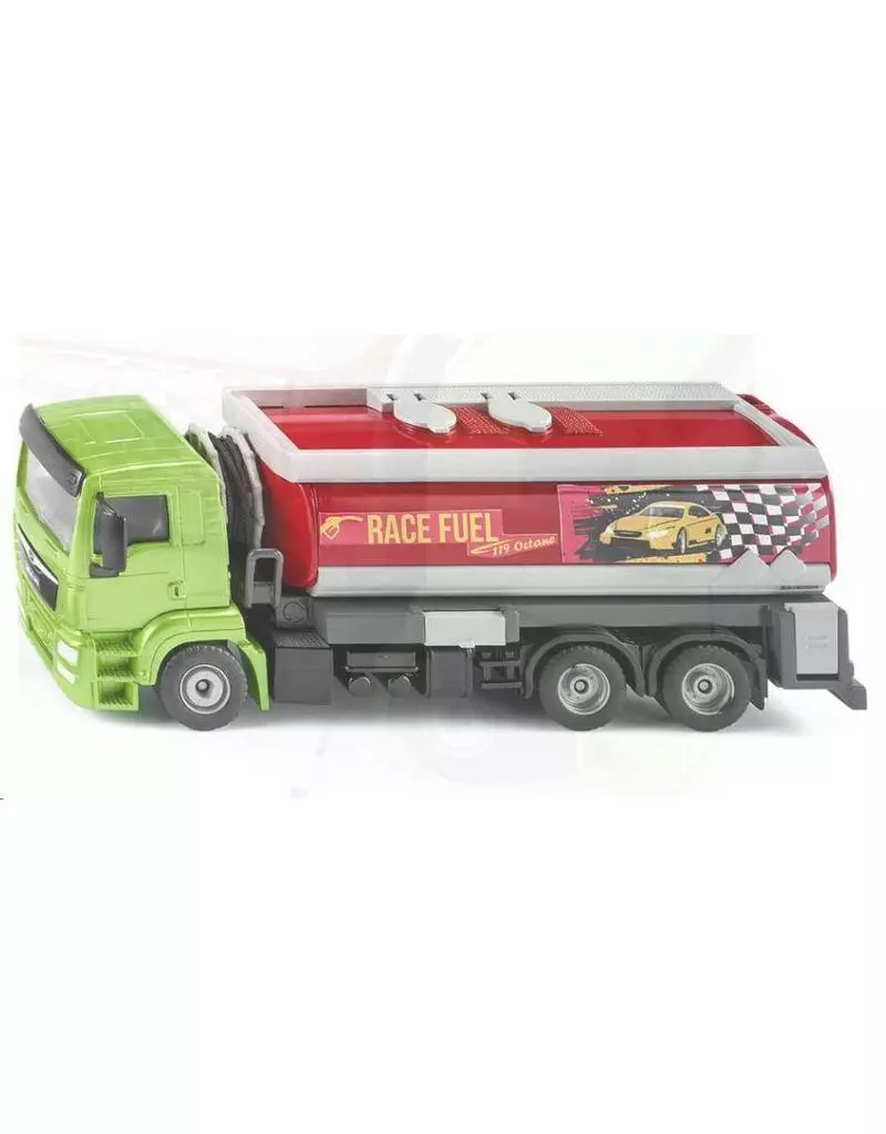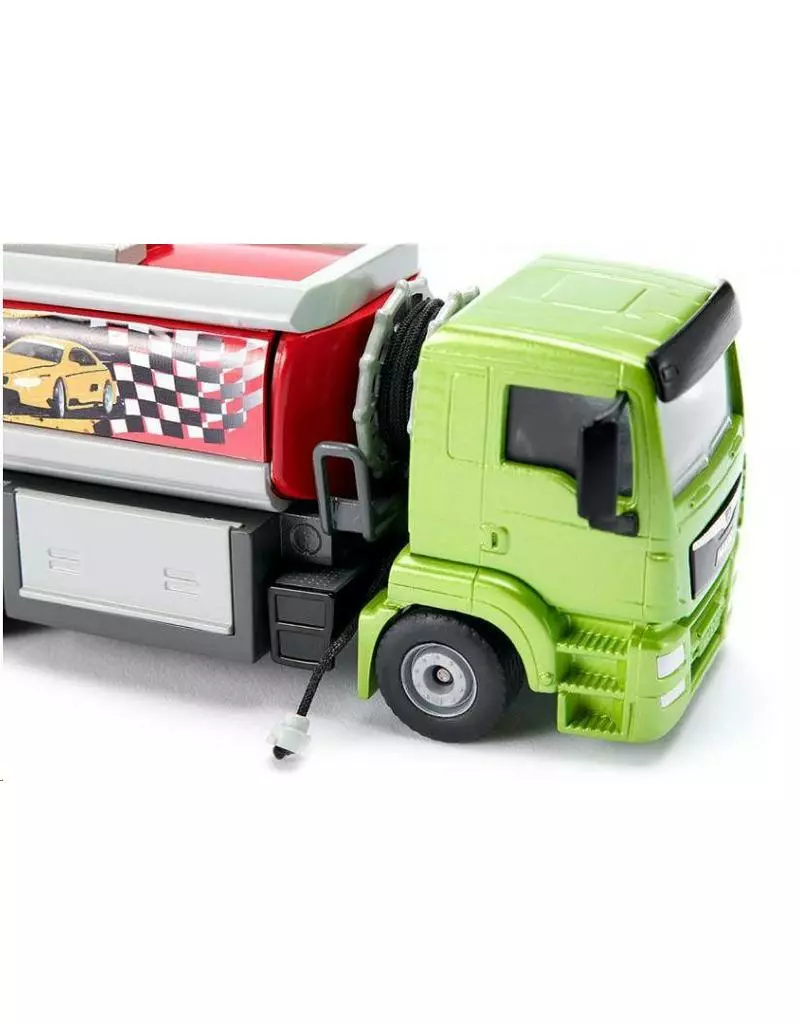 De naald van de brandstofmeter gaat bijna helemaal naar nul. Tijd om de SIKU supersportwagen bij te tanken. De nieuwe MAN TGM met tankopbouw van Esterer brengt de brandstof naar het benzinestation. Het hoogste octaangetal voor de Bugatti, Lamborghini en Co. Met behulp van de opgerolde slang achter de chauffeurscabine zijn ook de verder gelegen tankaansluitingen te bereiken. De tank kan via de kleppen op het bovenste deel worden gevuld. De technische delen van de installatie zijn via de vele kleppen op het voertuig te bereiken. De kunststoftank is veilig op het stevige drie-assige chassis van zink en de metalen cabine opgebouwd. De MAN met tankwagenopbouw is de perfecte aanvulling voor de SIKUWORLD sets Stad (5501) en de Werkplaats (5507) of voor gebruik in de steengroeve als mobiele brandstofpomp voor de Liebherr T264 dumper (1807) en de Liebherr R9800 mini-graafmachine (1798).